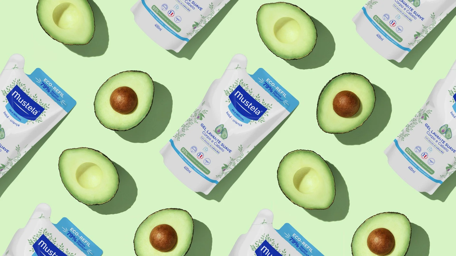 Pela falta de imagens do produto, desenvolvemos um Key Visual com apoio de inteligência artificial, integrando o produto de forma orgânica ao universo visual da Mustela. A IA foi usada de maneira estratégica para construir um cenário alinhado aos códigos da marca, sem perder credibilidade.
